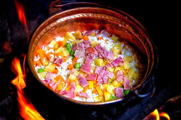 混合食材:将煎好的土豆、炒香的火腿豌豆倒入铜锅,加入浸泡好的大米,轻轻翻拌均匀,确保米粒分散。