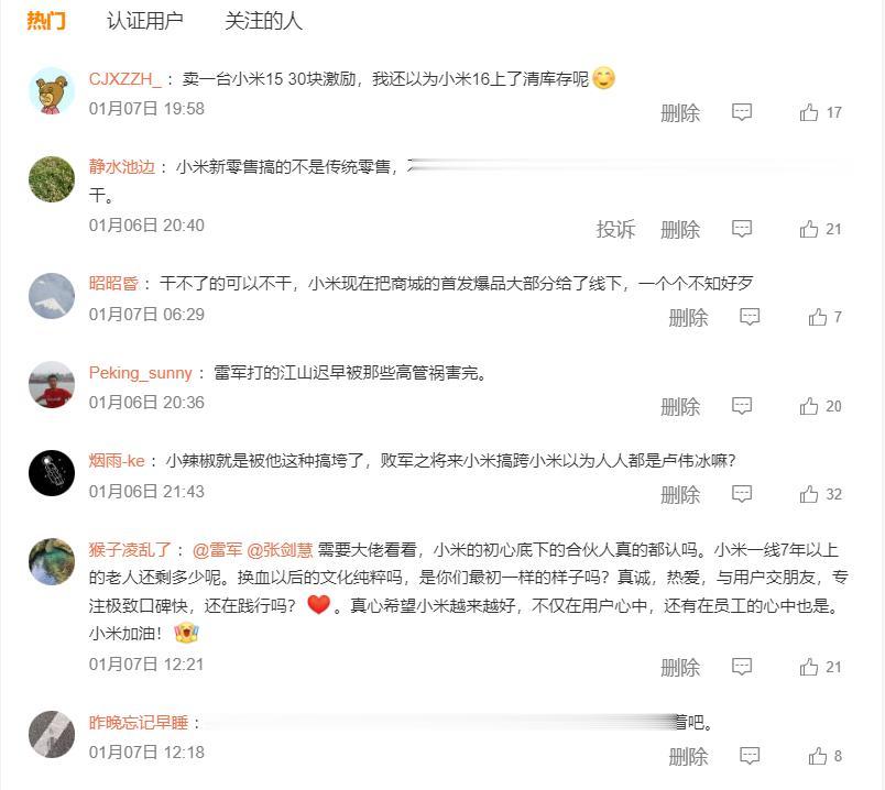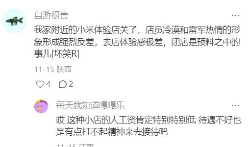 对于小米之家的此次关店计划,有网友称闭店是意料之中的事,他表示家附近的小米体验店关了,店员冷漠和雷军热情的形象形成强烈反差,去店体验感极差。