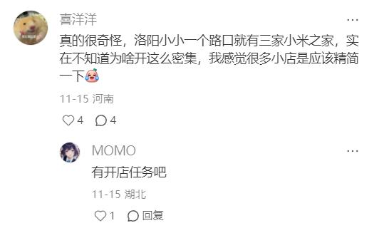 一名洛阳的网友称,真的很奇怪,洛阳小小一个路口就有三家小米之家,实在不知道为啥开这么密集,我感觉很多小店是应该精简一下。