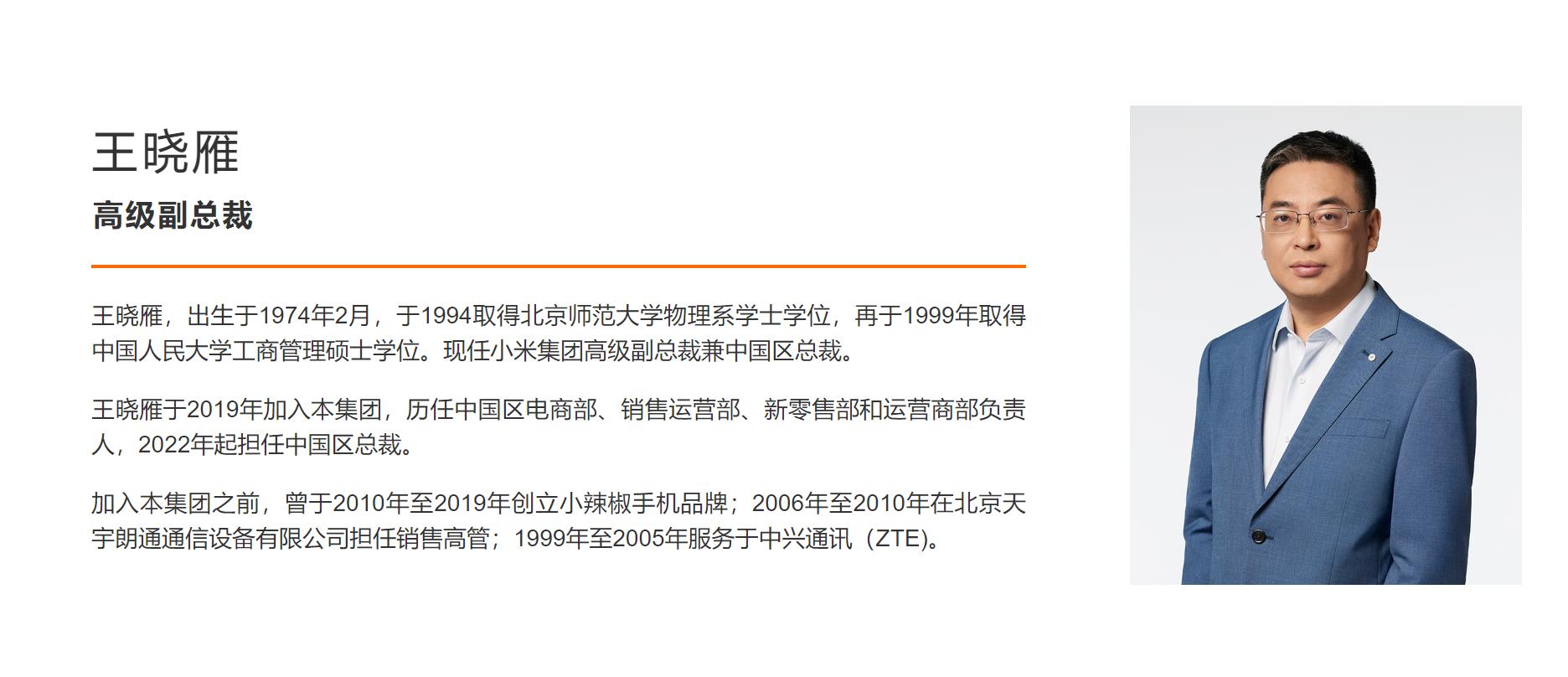 作为小米中国区总裁,王晓雁于2019年加盟小米,先后担任中国区电商部、销售运营部、新零售部和运营商部负责人,2022年他晋升为副总裁,兼任中国区总裁。