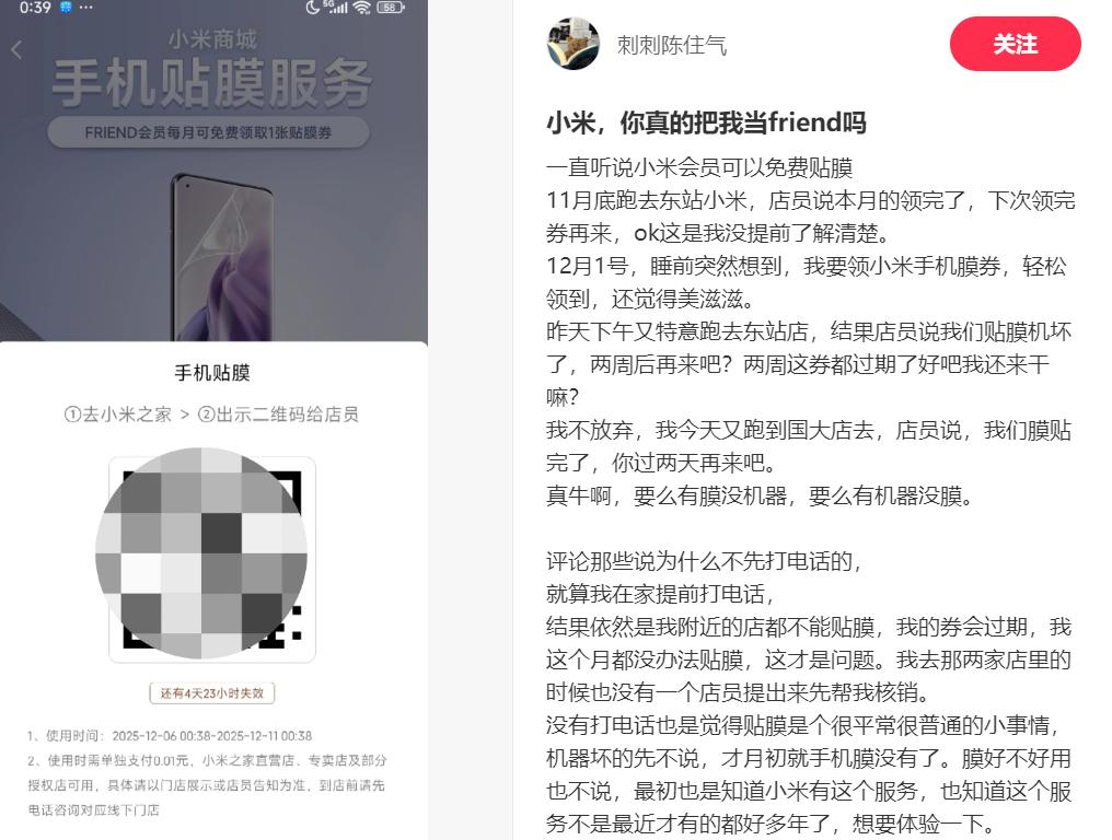 有网友称,一直听说小米会员可以免费贴膜,11月底跑去东站小米,店员说本月的领完了,下次领完券再来,ok这是我没提前了解清楚。