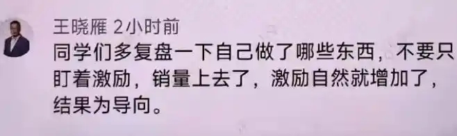 今年1月份,一份来自小米零售通的截图显示,王晓雁回应小米员工:“同学们多复盘一下自己做了哪些东西,不要只盯着激励,销量上去了,激励自然就增加了,结果为导向。”该言论引起网友吐槽。