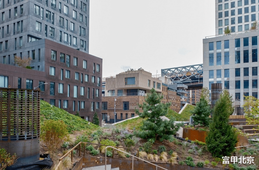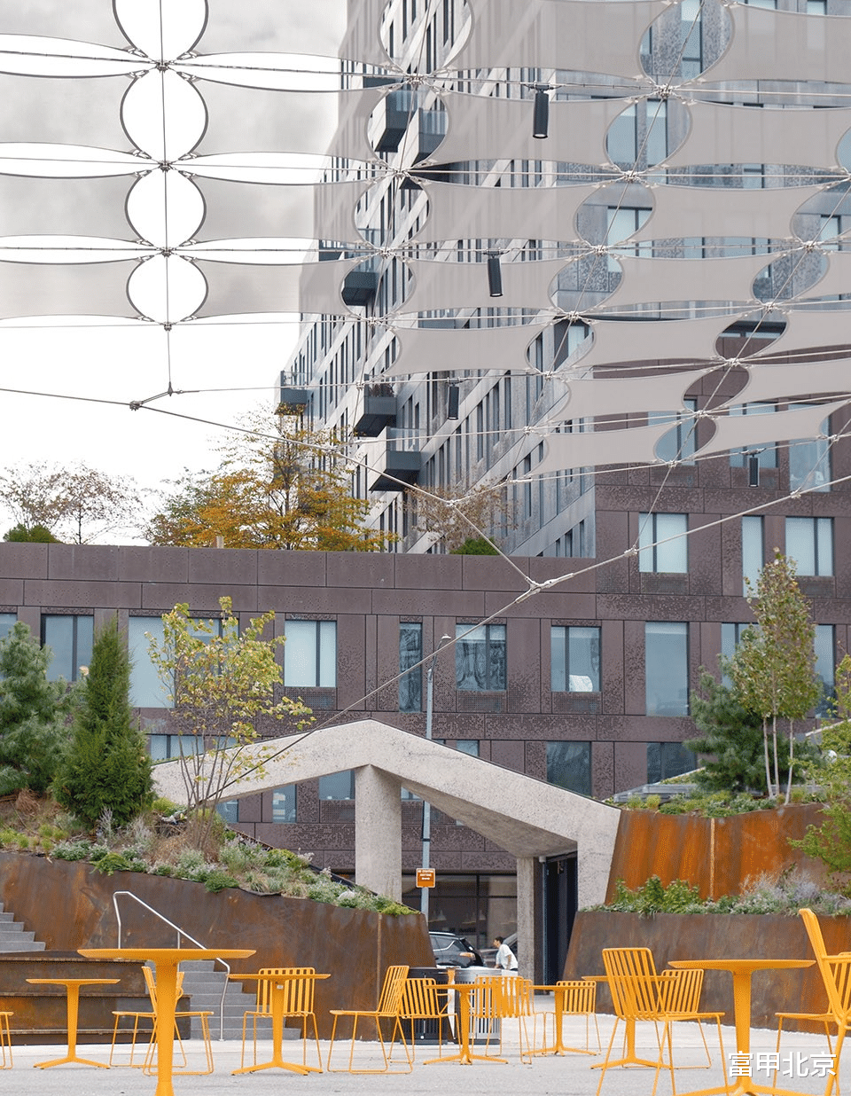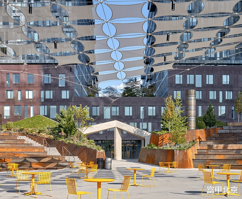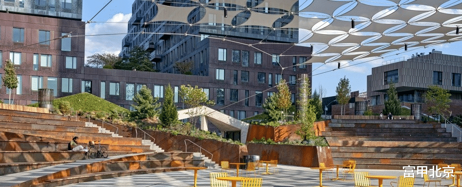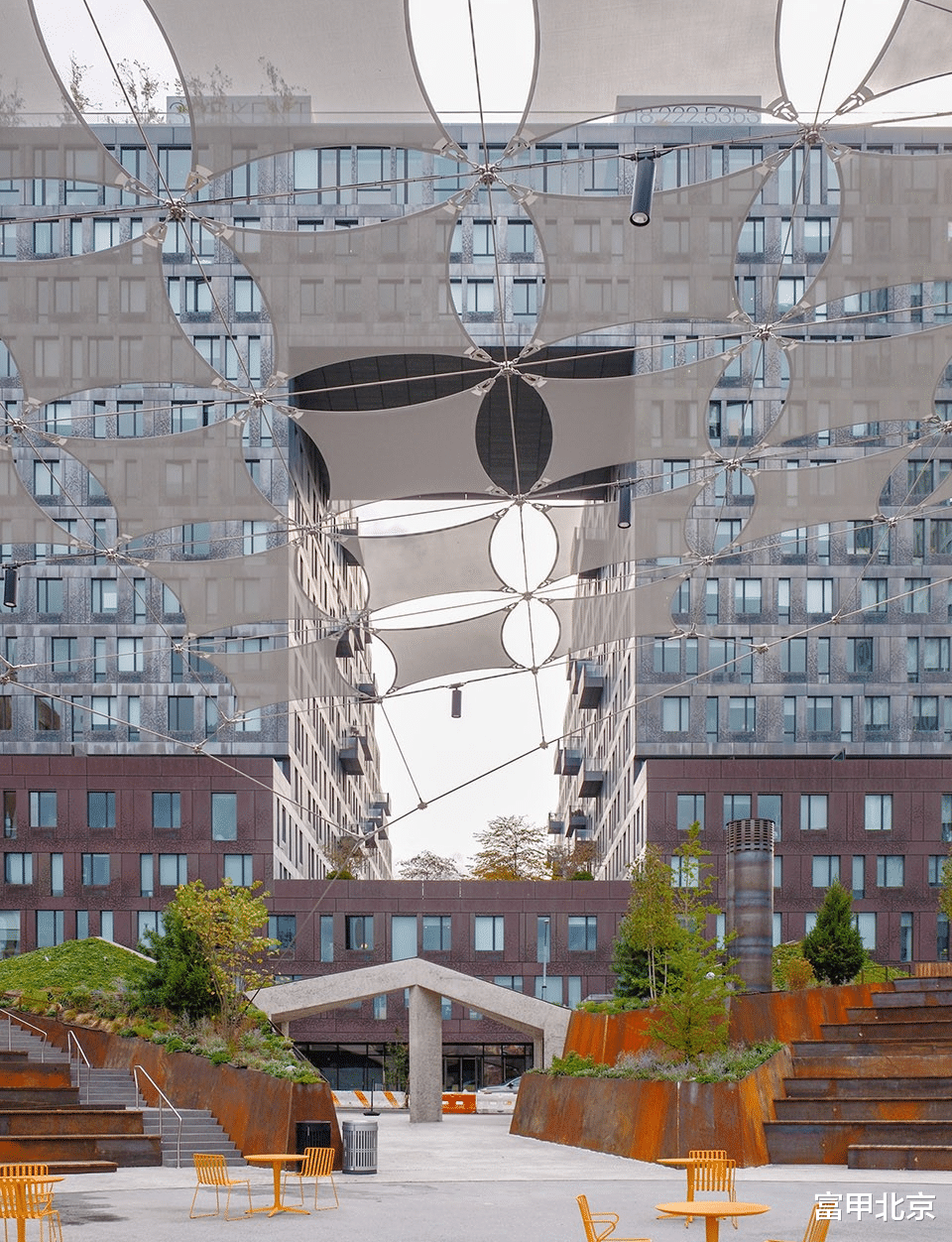 广场内的阶梯座位周围环绕着由常绿树和落叶树组成的混合植被带,植被带用耐候钢围起,为全年各季节的活动提供阴凉和包围感。