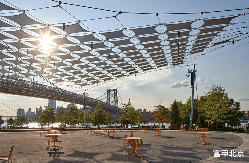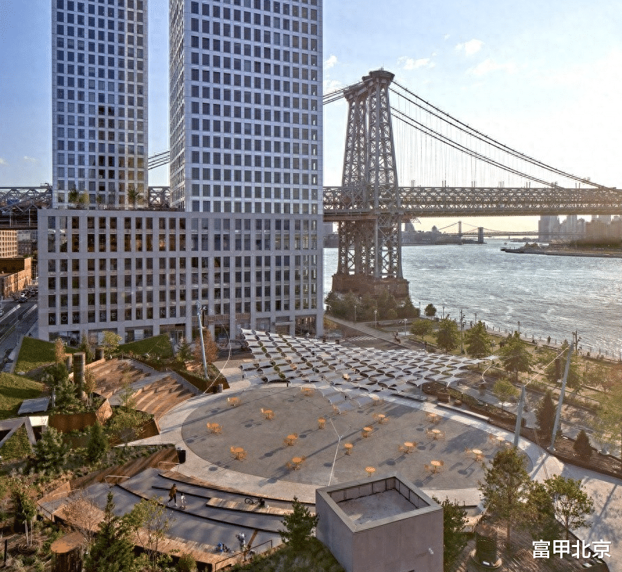 在西南角的一个更为宁静的公园式区域,设置了亲密的座位角落和休息区,由一系列高架植被带塑造,营造出一个葱郁的阴凉环境。这些植被带进一步隔离了广场内部,并为邻近的住宅塔楼提供了缓冲。西南角的新座椅俯瞰着多米诺公园和威廉斯堡大桥。
