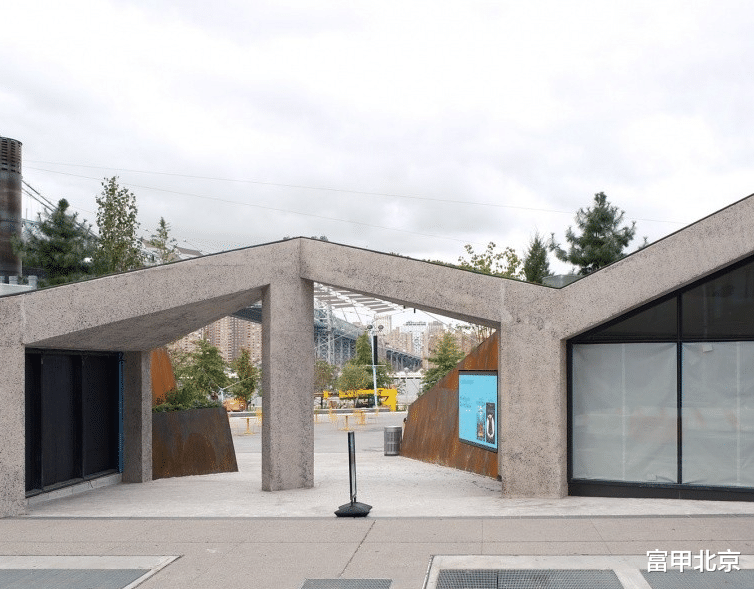 由Studio Cadena设计的零售拱廊由一系列现浇混凝土柱沿街道周围围成,形成一个对零售空间和公园入口的长廊。材料选择坚固实用,既反映了建筑靠近东河的位置需求、抗风暴的设计需求,也延续了Domino场址作为一个曾经的工业用地、现已改建利用的历史。混凝土柱经过喷砂处理,显现出蓝石的骨料,为外立面增添了色调和质感。与其遮掩水处理设施下方的烟囱不同,这些管道穿透建筑,明显出现在绿化屋顶上方。