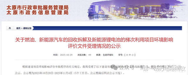 第一动力电池回收消息,近日,山西省太原市行政审批服务管理局正式对外公示了《山西环擎再生资源利用有限公司新能源锂电池的梯次利用项目》的环境影响评价文件受理情况,标志着这一绿色转型的重要一步即将落地实施。该项目总投资高达7600.96万元,选址于太原市清徐县清徐经济开发区内的高端装备制造产业区,旨在通过先进的技术手段实现废旧汽车动力电池的有效回收与再利用,为新能源汽车产业的可持续发展注入强劲动力。