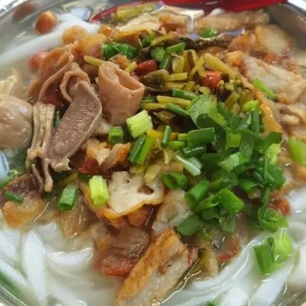 配料则是海陆交响曲。自家打的马鲛鱼饼洁白弹牙,炸鱼块外酥里嫩,虾干与虾酥提供浓缩的鲜味。再加上几片猪肉、一撮豆芽、一勺花生碎,最后撒上酸菜末和葱花——酸菜的爽脆平衡了汤的丰腴,花生的焦香则增添了意外之喜。
