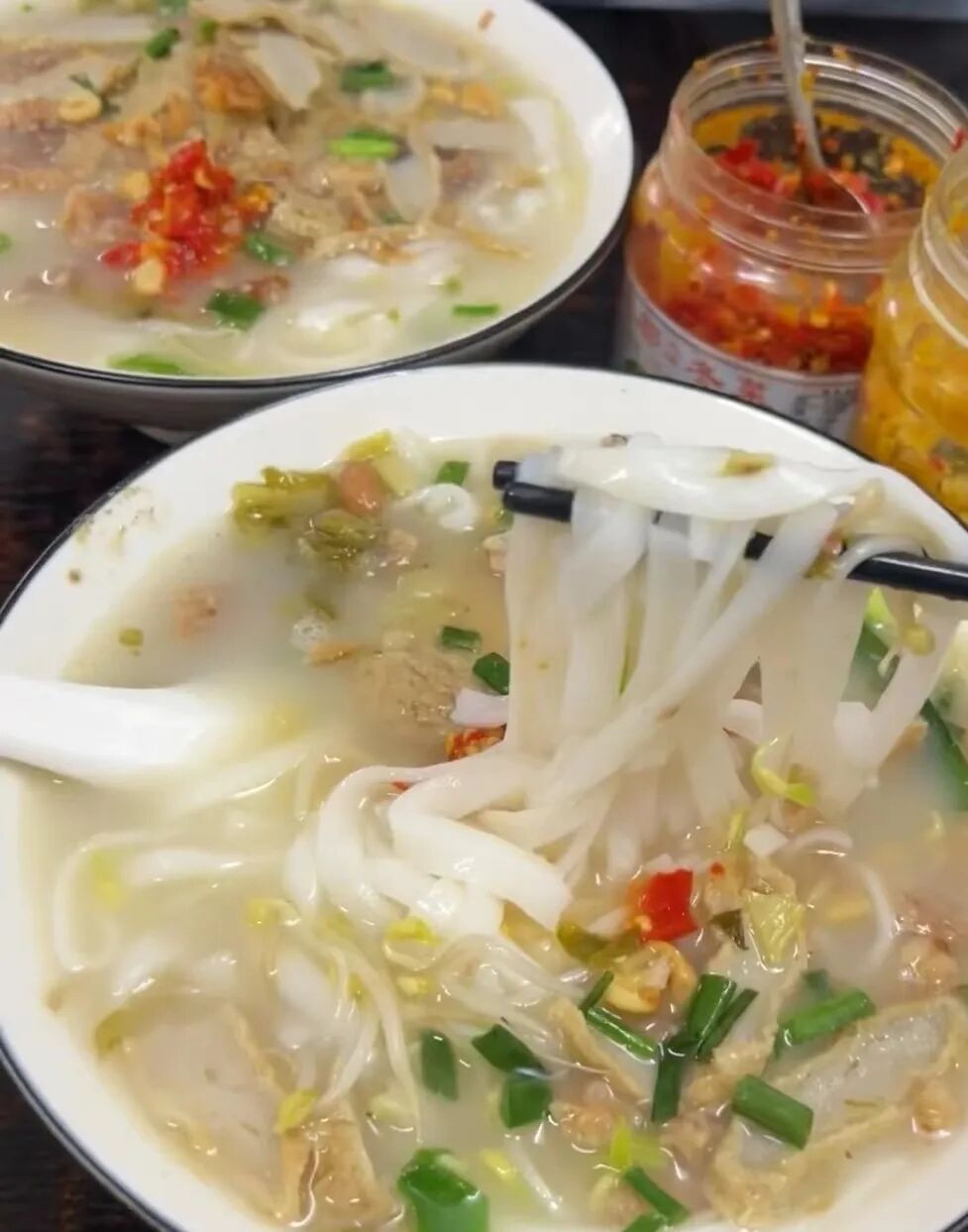 一喝汤。真正的行家会先喝三口原汤:第一口试温度,第二口品鲜度,第三口才慢慢感受层次的展开。好的港门粉汤清而不寡,鲜而不腥,暖意从口腔一直落到胃里。