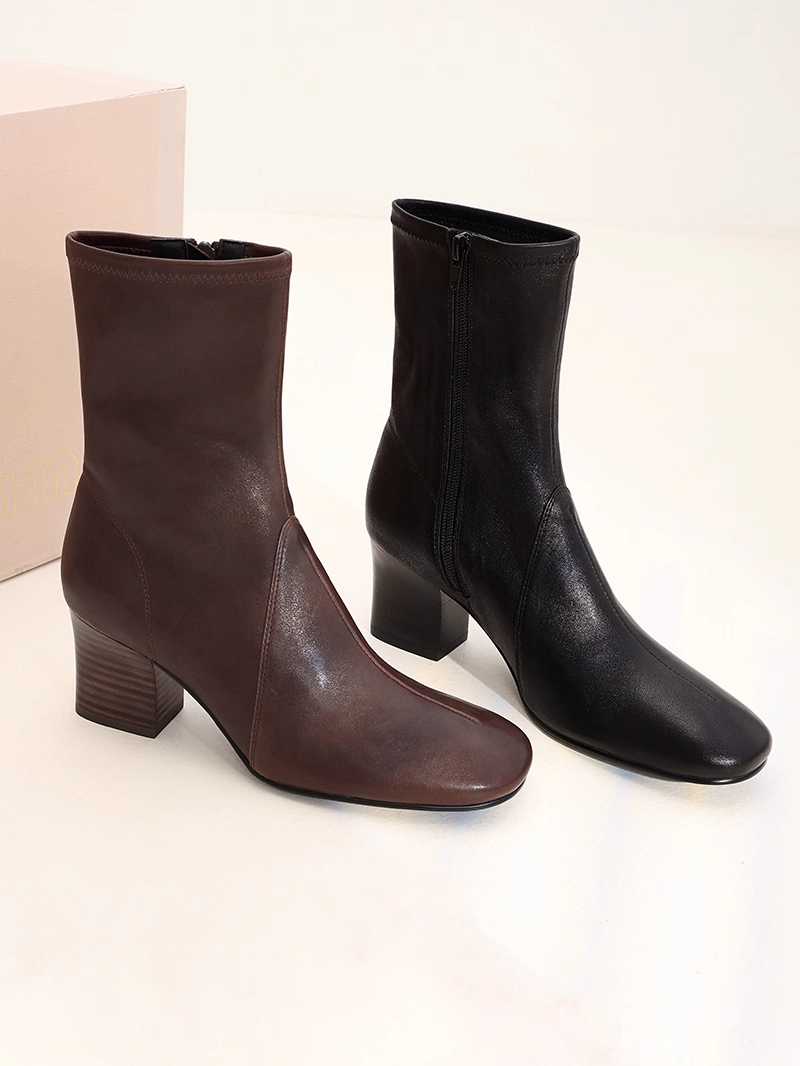 比如下面这款短靴,鞋跟采用细跟渐变菱形设计,鞋身褶皱克制且富有质感,鞋头兼顾方形利落与圆润柔和,刚柔并济的线条简约却有层次,完美诠释 “不费力的时髦”。
