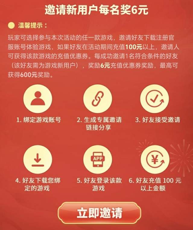 除了100%必得充值优惠券外,活动还为大家准备了邀请新用户的必得好礼。邀请好友下载并注册官服账号体验游戏,当好友活动期间充值100元以上时,邀请人便可以拿到最高600r的优惠券奖励!邀请步骤攻略呈上,是时候喊上游戏搭子,一起体验官服的游戏乐趣啦~