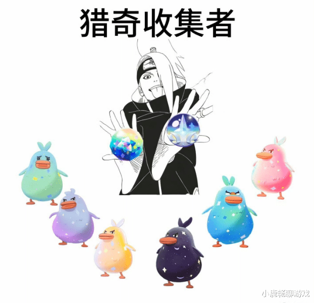 猎奇收集者:迪达拉看了都得说一句专业,这类玩家的人生信条就是:万物皆可收集,没有我抓不到的宠物!就像迪达拉痴迷艺术爆炸一样,他们痴迷于游戏里的各种稀有、奇葩宠物,尤其是那些造型独特的异色鸭鸭,从清新薄荷绿到神秘星空黑,每一只都要收入囊中。他们不在乎战力,不在乎 PVP,只要图鉴没满,就永远在抓宠的路上,背包里全是各种奇奇怪怪的宠物,主打一个 “万物皆可盘”!