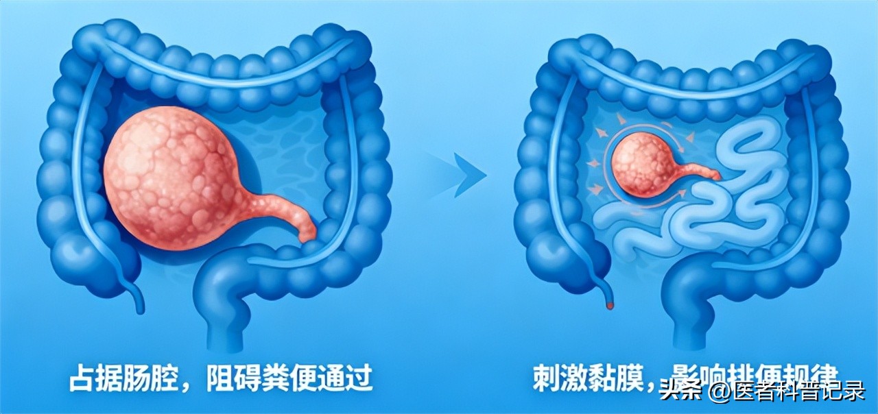当息肉越长越大,肠道就像被堵住,便秘跟着来了,同时,它还会不断刺激肠道,让排便更不规律。当息肉同时引起这两种效应,或肠道功能在梗阻与刺激之间失衡时,就会表现出便秘与腹泻交替出现的情况。