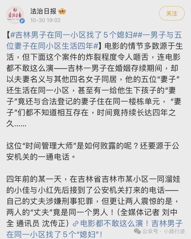 更炸裂的是,他和五位“妻子”共同生活在一个小区,甚至有两位“妻子”住在同一栋楼的同一单元!