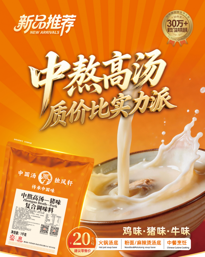 广泛覆盖面馆、火锅、快餐、卤味、麻辣烫等主流餐饮业态的刚需品类,骨汤赛道长期存在“品质与价格难以兼顾”的行业痛点:高品质骨汤终端售价普遍在30-40元/公斤,多数中小门店难以承受;部分定价较低的骨汤产品存在原料标准不一、风味不稳定等问题。深耕骨汤赛道近30年的独凤轩近期推出20元/公斤中熬高汤产品,凭借“同品质价格更亲民、同价格品质更优”的核心优势,迅速成为行业关注的焦点,为破解骨汤品类长期痛点提供了参考性解决方案。