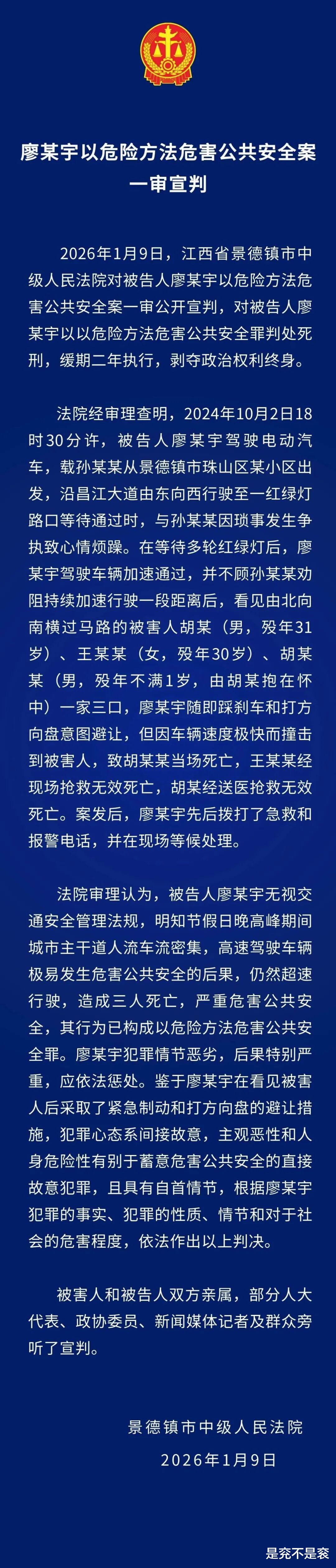 廖某宇案一审宣判,判处廖某宇死刑,缓期二年执行。