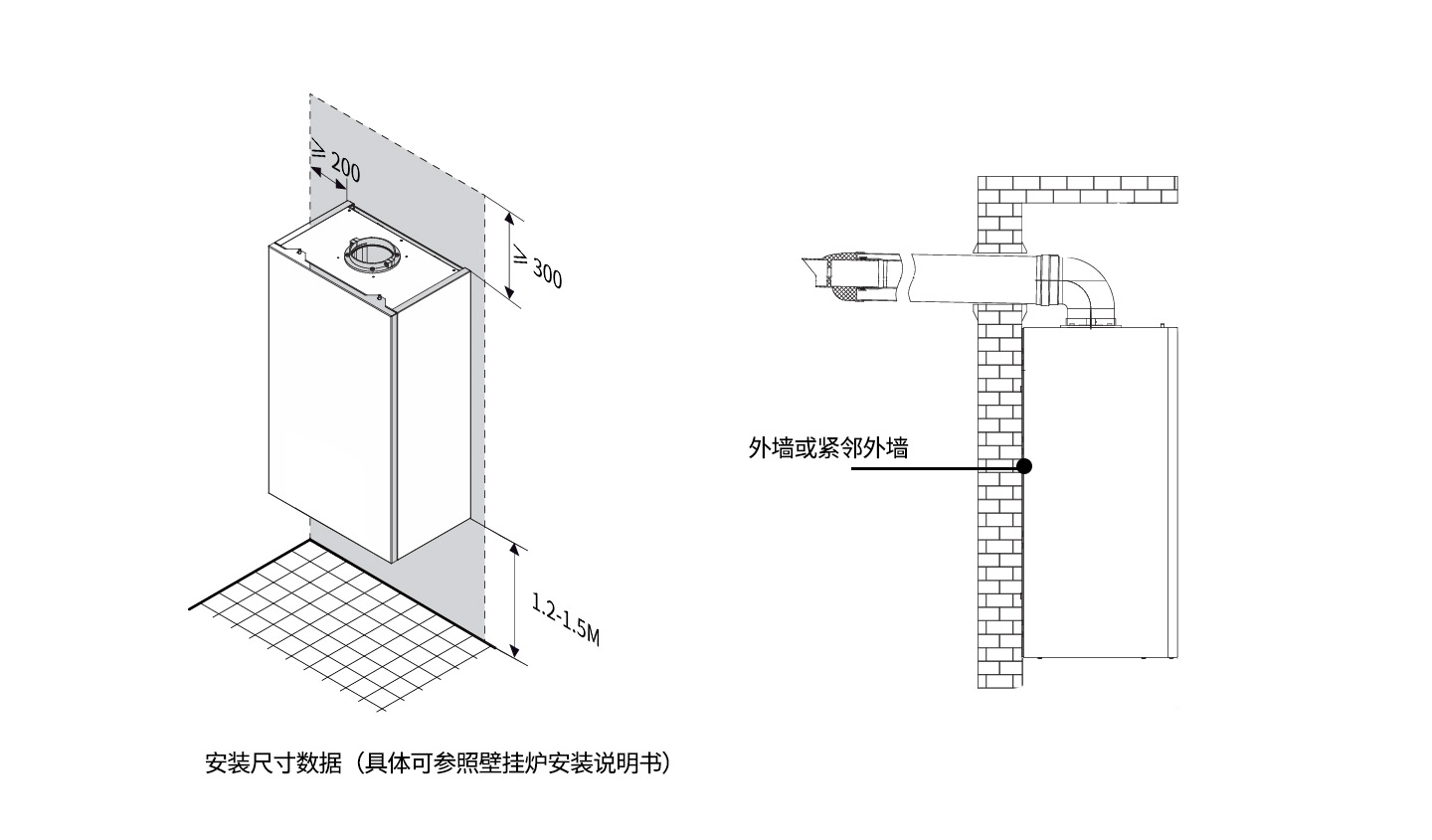 5.1、采用强制排烟平衡式烟道,同轴烟管或分离双管,烟管口径按壁挂炉原装或说明书要求使用。同轴烟道常见规格有ϕ60/100和ϕ80/125两种。