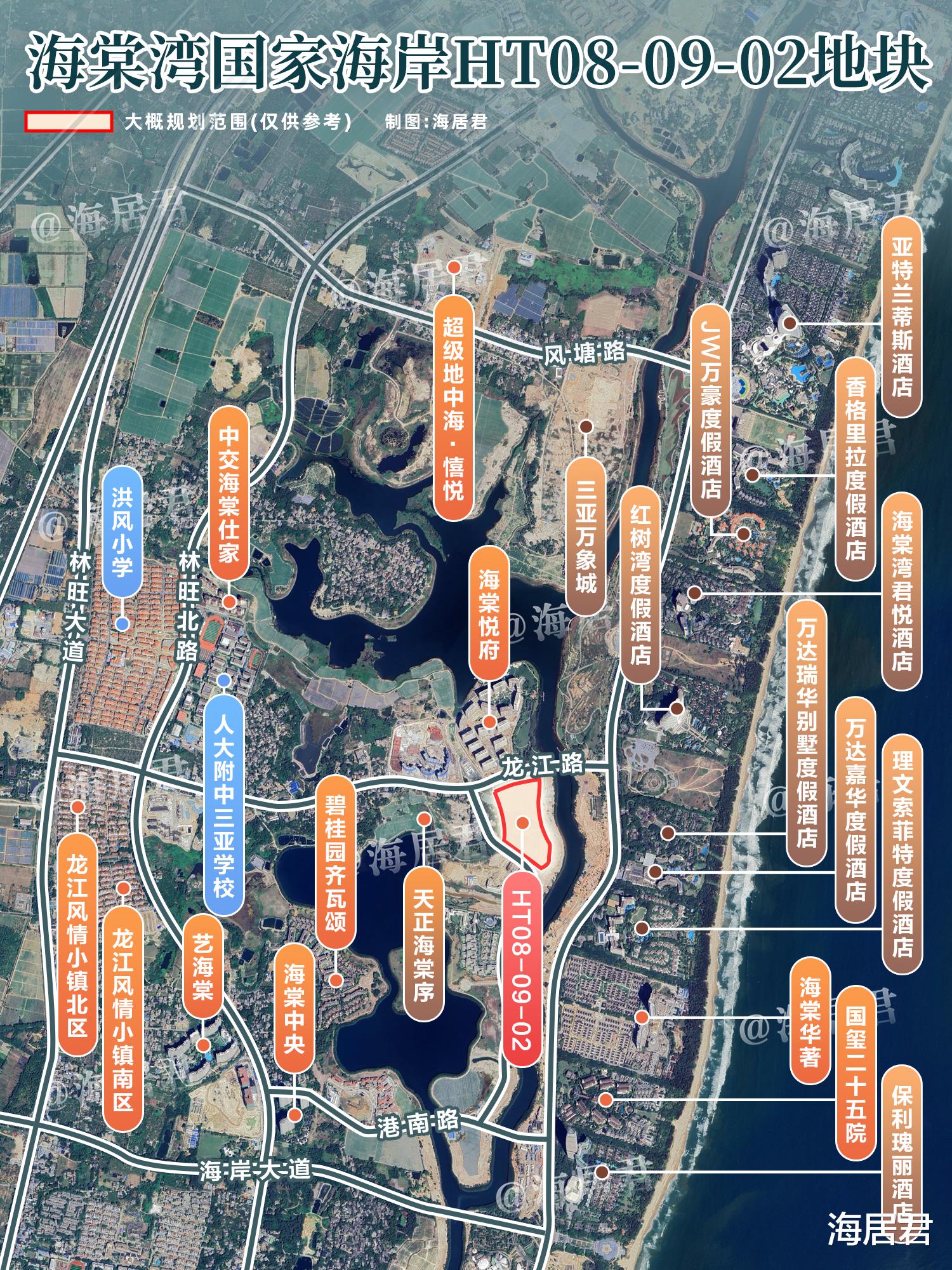 HT08-09-02地块区位优越,占据海棠湾国家海岸核芯板块,位于海棠湾龙江塘片区,地处龙江路和海棠北路交叉口西南侧,海棠河与龙江塘水系之间。