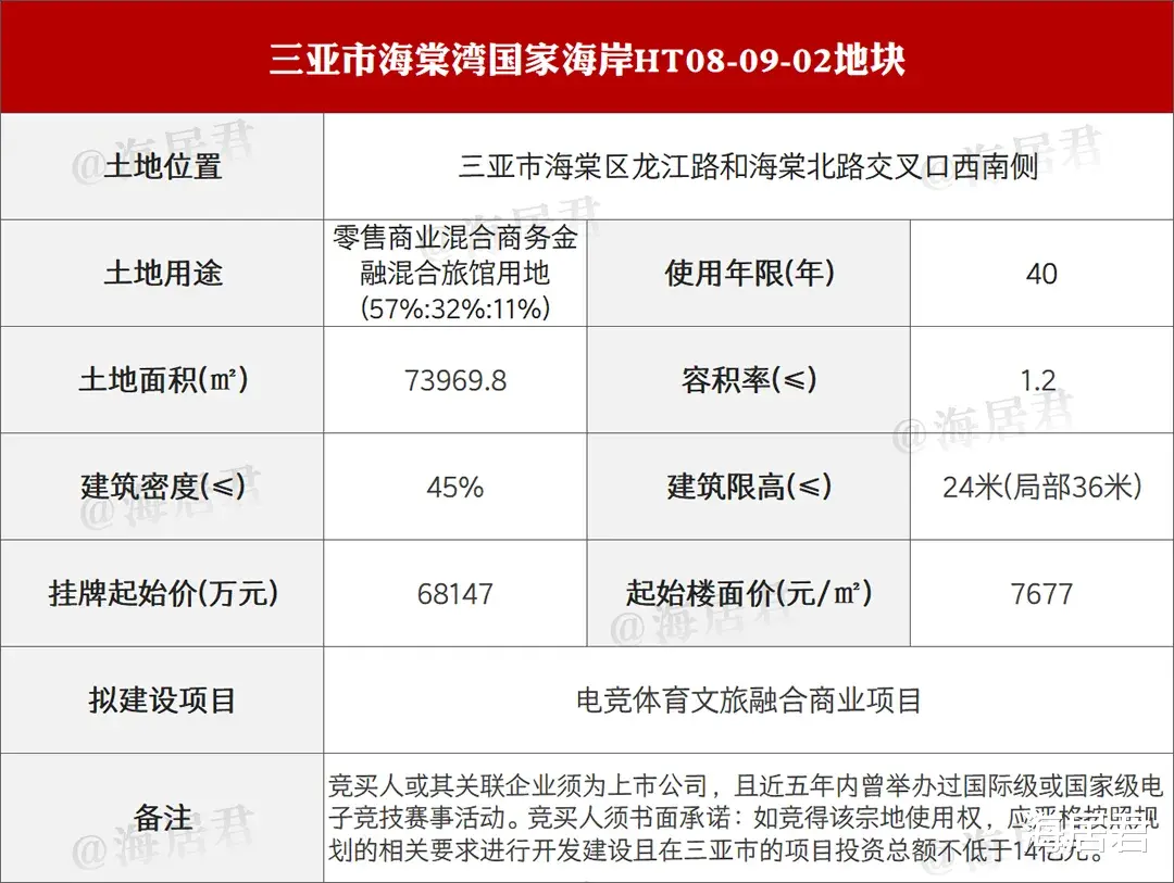 今天挂牌的HT08-09-02地块,要求竞买人须为上市公司,且近五年内举办过国际级或国家级电子竞技赛事活动;在三亚的项目投资总额不低于14亿元。