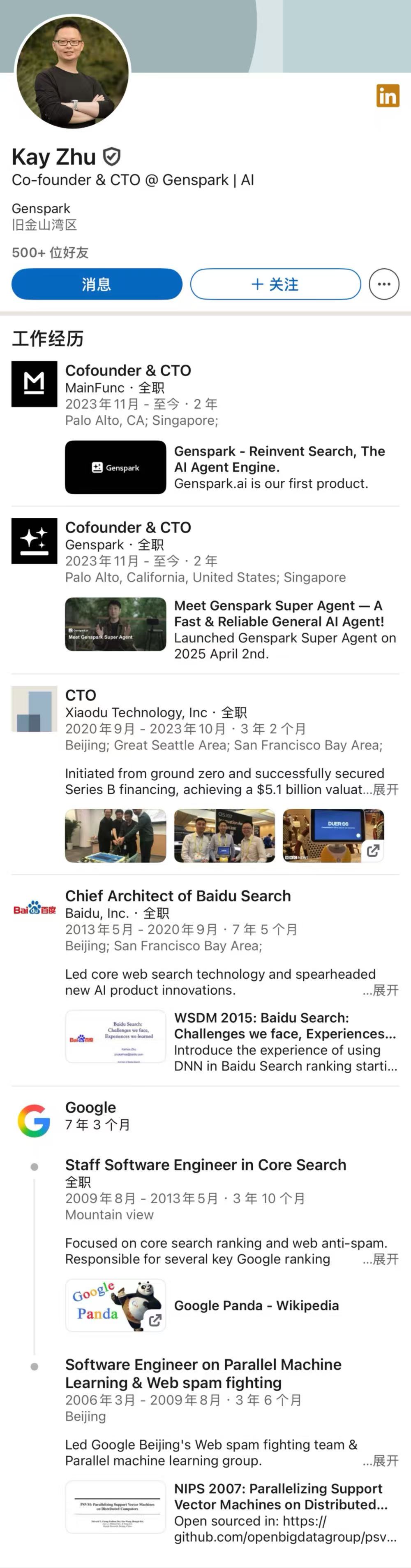 二、“小度之父”带队,既是大厂“熟人局”,也是名校“学霸团”Genspark的创始团队也颇为亮眼。据领英公开资料,目前有五位联合创始人在该平台上有信息可查。