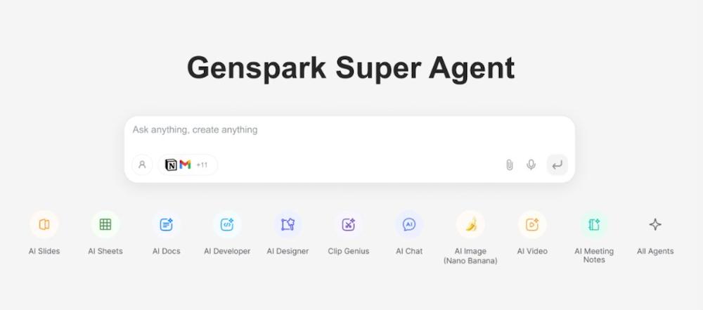 据智东西统计,仅在10月一个月内,Genspark就完成了4项大小功能的更新与迭代。此前,其产品体系已覆盖10款核心工具,包括AI Slides、AI Sheets、AI Docs、AI Browser、AI Image、AI Chat、AI Clip Genius、AI Designer、AI Developer与AI Meeting Notes。