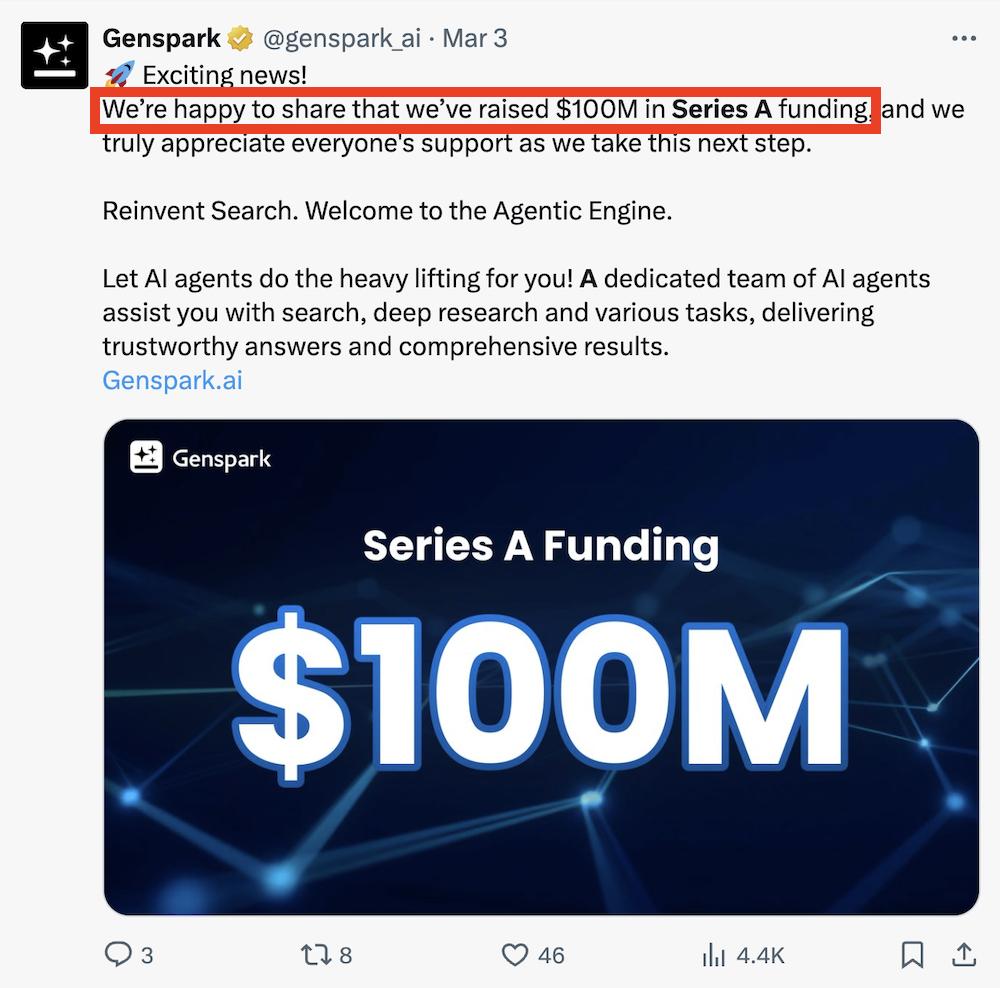 今年3月,Genspark刚完成一笔1亿美元(约合人民币7.1亿元)的A轮融资,投后估值为5.3亿美元(约合人民币37.6亿元)。而仅仅半年后,其估值便迅速翻倍。