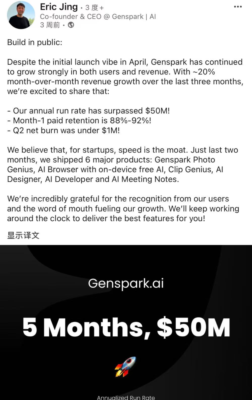 联合创始人兼CEO景鲲在本月初的领英发文中披露,过去三个月,其公司营收环比增长超过20%。截至2024年第三季度,Genspark的年化经常性收入(ARR)已突破5000万美元(约合人民币3.5亿元),首月付费用户留存率达88%–92%,第二季度净亏损控制在100万美元(约合人民币711万元)以内。