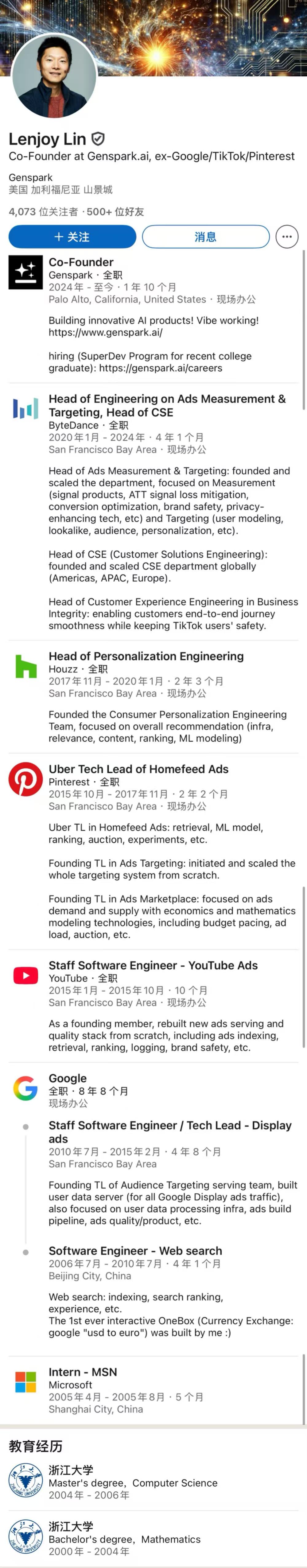 另一位联合创始人Lenjoy Lin本硕毕业于浙江大学,曾在YouTube、Pinterest、TikTok、字节跳动等平台负责广告与推荐系统研发,主导构建了用户个性化推荐、定向广告投放与模型优化相关的技术。