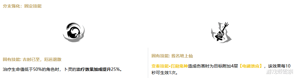 两个固有技能,一个是抬半血以下角色时提升25%治疗效果加成,一个是变奏技能造成伤害附加4层电磁效应,和技能组没有什么强联动,第二个是投资未来的电磁效应队。