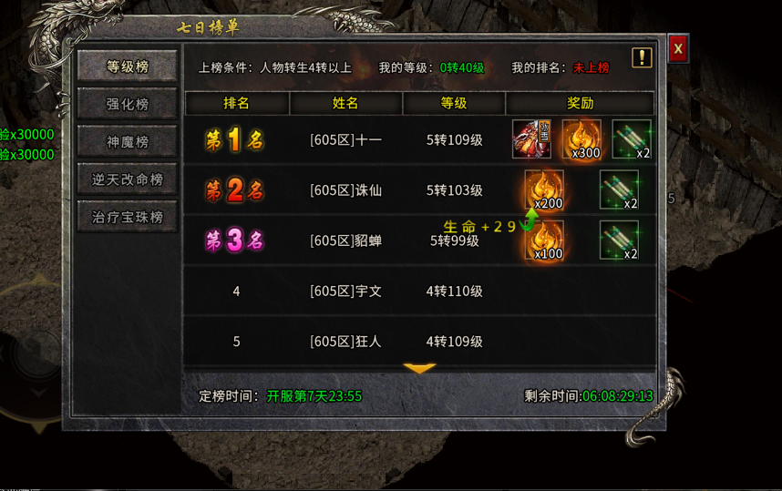 半天:40 级 + 4 转材料过半 + 武器 + 7