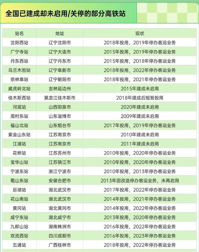 大家看看广西某市的五通站。2018年风风光光地剪彩启用,苦苦支撑到2022年,实在熬不住巨额亏损关停了。如今那宽敞平整的站前广场干嘛用呢?变成了附近村民天然的晒谷场。再看看海南某市的海头站,真金白银砸进去4000多万,修好之后大门紧锁,多年不投入使用。一个常住人口满打满算才百万出头的海岛小城,当年硬着头皮给自己规划了三座高铁站。还有东部某市的紫金山东站和江浦站,建成至今十几年,铁轨都熬生锈了,依然没能等来开通的那一天。
