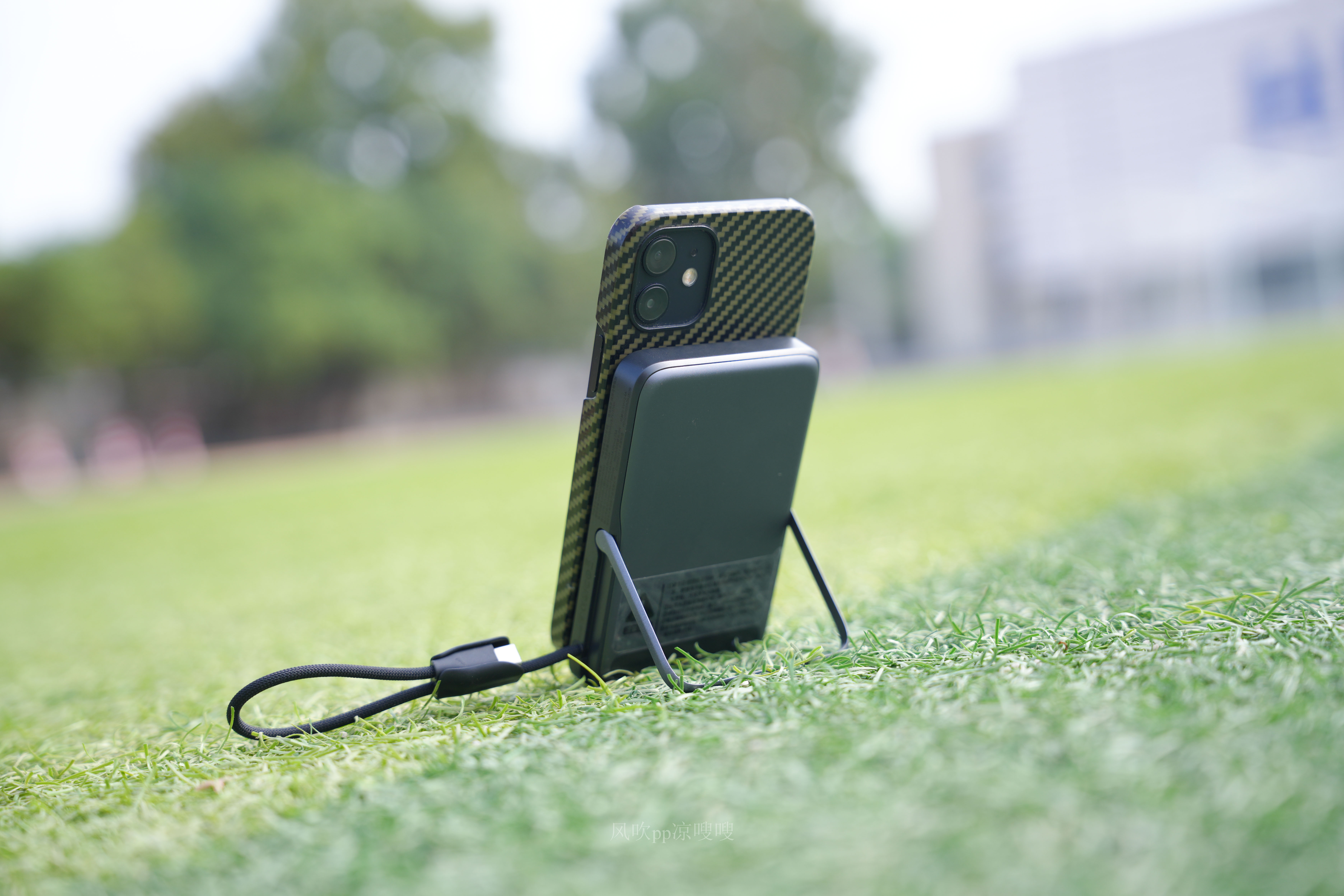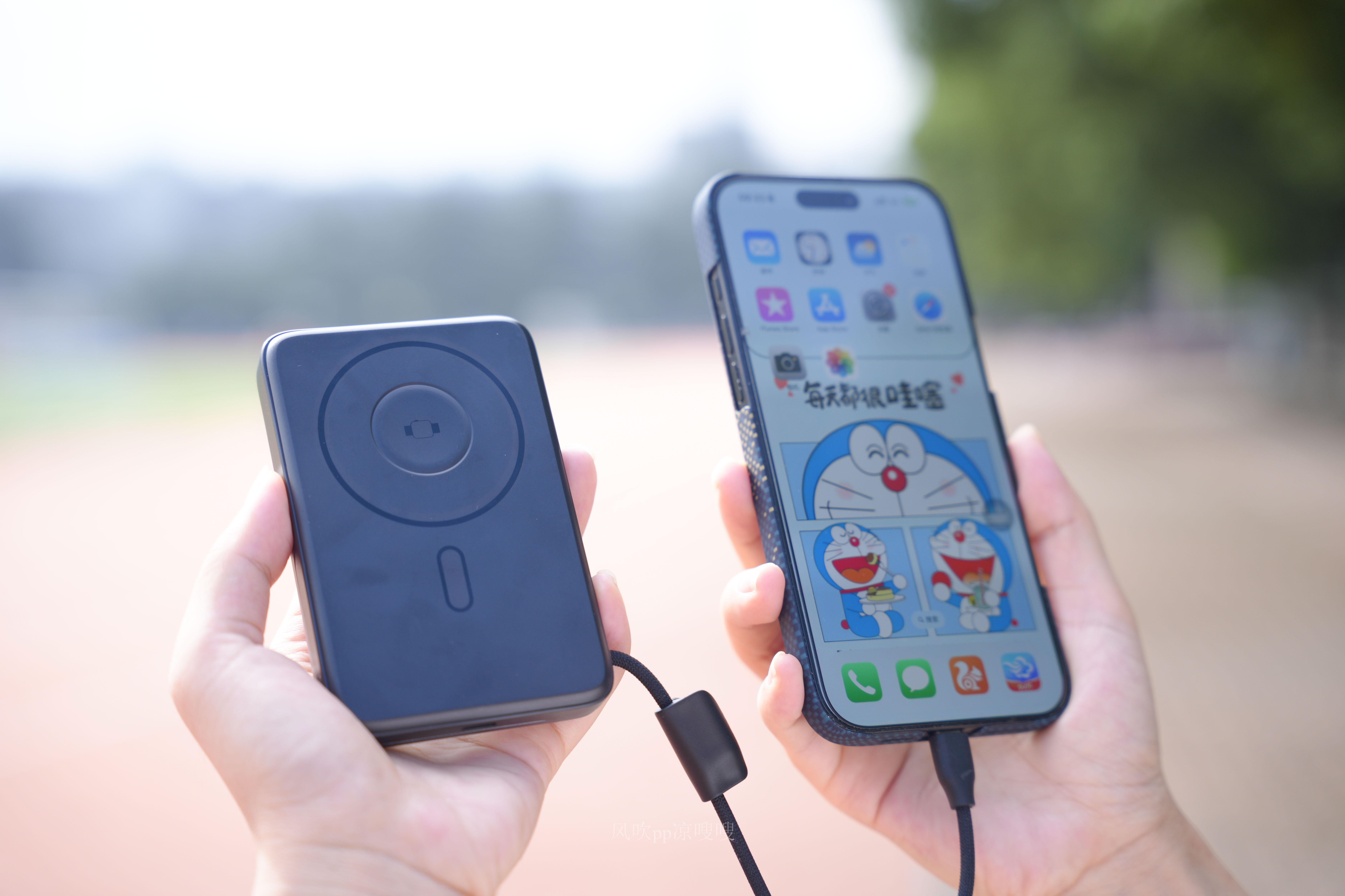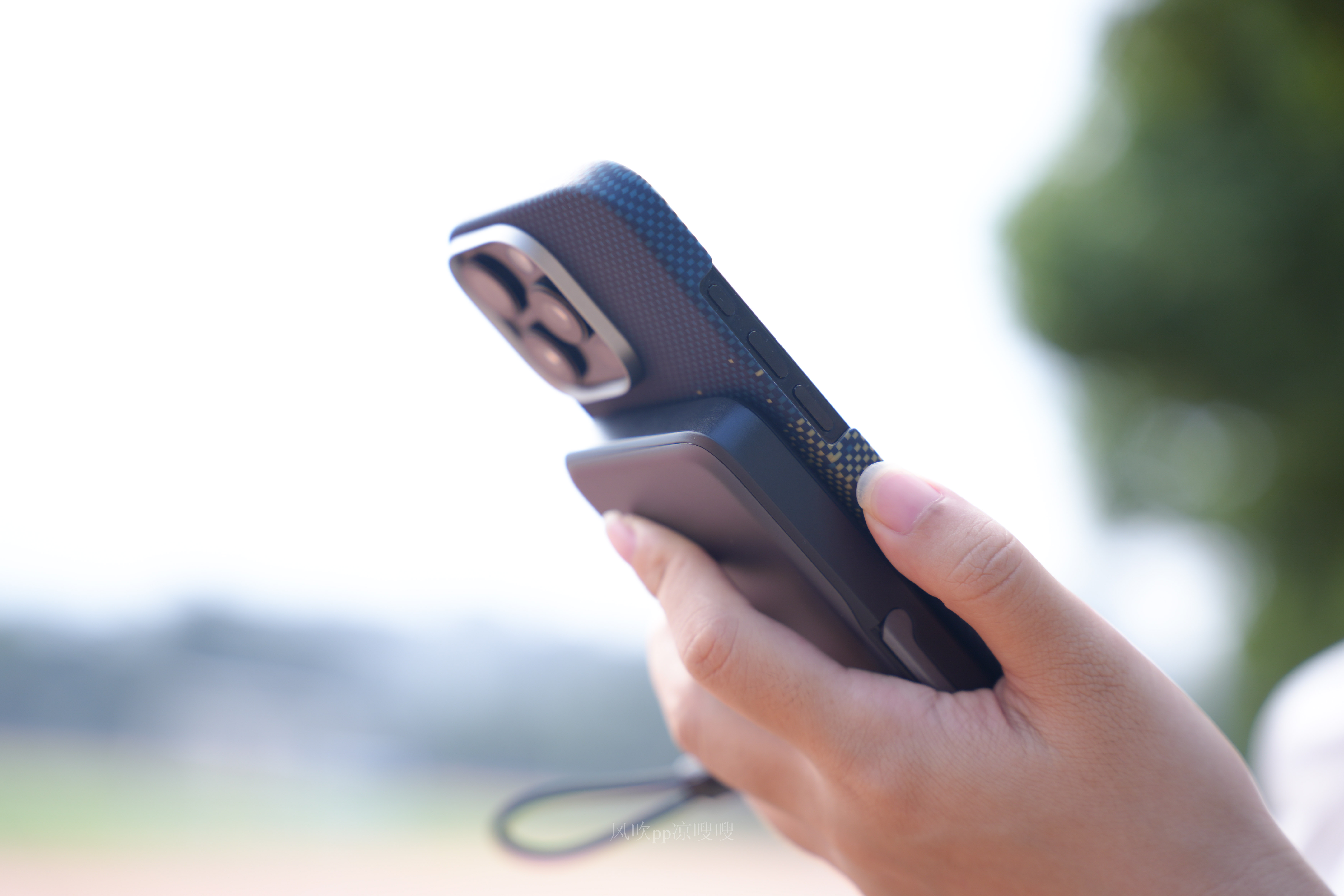 尺寸方面,充电宝长宽厚分别为109mm x 70mm x 15mm,实测重量约227克,吸在我的iPhone上充电时,既不会挡住摄像头,也不会因为太重而影响边走边回消息。这种无感携带的体验很便利。