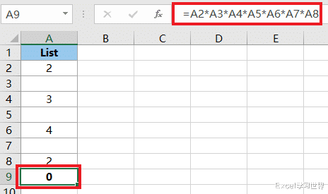 如果要将区域中的所有数值相乘,最笨的办法可以用 * 将每个单元格连接起来,老手则会使用 product 函数。但是,在这个案例中,两种方法的结果并不一样。
