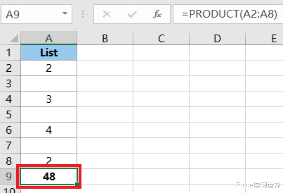 如果用公式 =PRODUCT(A2:A8) 的话,结果则变成了 48。