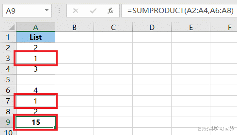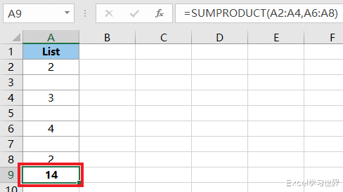 sumproduct 的作用是对乘积求和,这个公式拆开来就是 A2*A6+A3*A7+A4*A8=2*4+空*空+3*2;