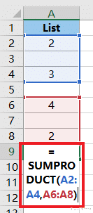 =SUMPRODUCT(A2:A4,A6:A8)