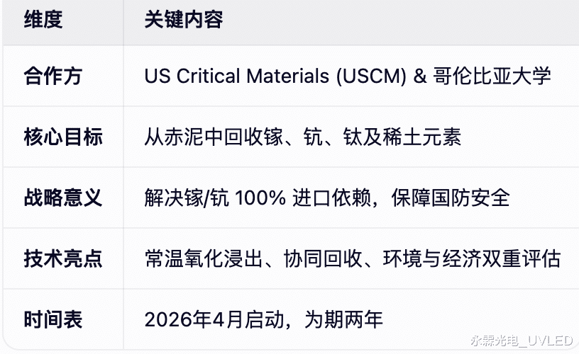 2026年4月16日,美国关键材料公司(US Critical Materials Corp, USCM)与哥伦比亚大学签署了一项为期两年的赞助研究协议。双方将启动名为“Mud To Metal”(从泥到金属)的项目,旨在开发从赤泥(铝精炼的主要副产品)中回收镓、钪、钛和稀土元素的技术。