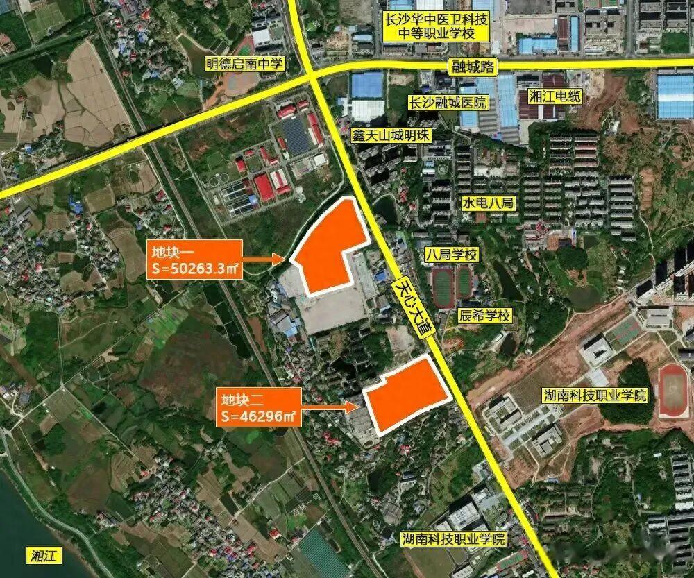 本次拍卖的两宗地块位于天心大道西侧、湖南科技职业学院天心校区北侧。土地规划用途为商住用地,地块一面积50263.3㎡(商业占比15%),地块二面积46296㎡(商业占比12%),土地使用权剩余59.23年。