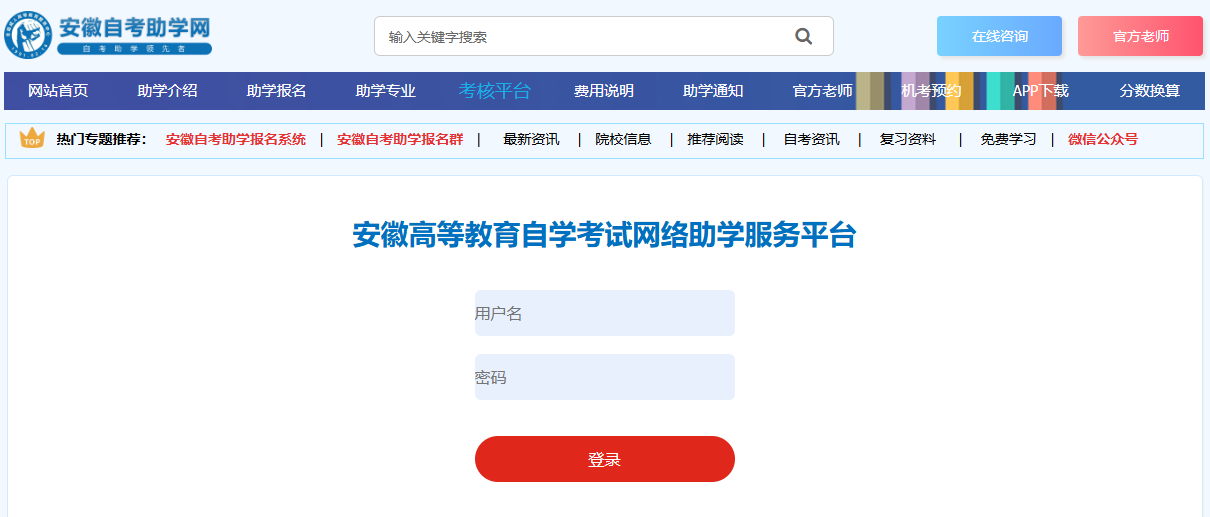 安徽省自考助学核心平台为安徽自考助学网(网址:www.anhuickw.com),该助学平台的助学专业涵盖了大部分安徽自考专业,提供标准化的助学服务。考生可通过平台完成课件学习、平时作业、平时测验和终结性上机考试获取助学分。
