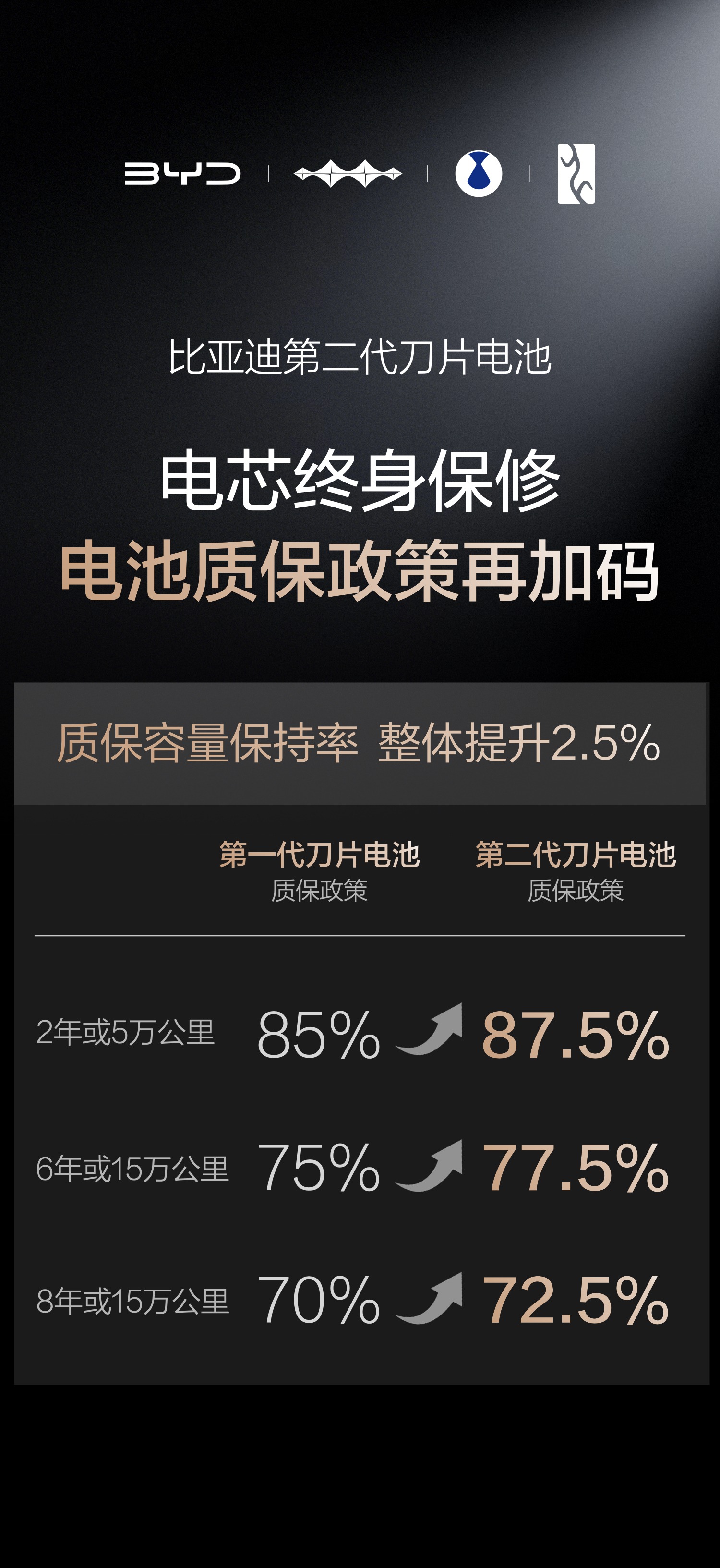 六年磨一剑,比亚迪第二代刀片电池重磅登场。这一次,比亚迪用“硬核闪充技术”不仅刷新了充电速度的极限,更一举攻克了行业内“闪充影响电池寿命与安全”的核心矛盾,真正树立了动力电池的新标杆。如果说第一代刀片电池重新定义了安全,那么第二代产品则用实力证明了:闪充,同样可以与长寿命兼得。针对用户“充得快,电池是否耐用”的疑虑,比亚迪通过构建“锂离子高速通道”与“全温域智能热管理系统”,从根源上解决了大功率充电产热高的难题。它让闪充过程产热更低、散热更快更均匀,使得常温下“5分钟充好,9分钟充饱”、严寒地区充电效率也接近常温成为现实,真正做到了既快又耐用。正是基于对“长寿命”与“安全”的绝对信心,比亚迪宣布质保政策再加码。第二代刀片电池的质保“容量保持率”标准整体提升2.5%,这意味着电池容量若低于77.5%即可享受免费包换服务,电芯依旧终身保修。这份“最强定心丸”,是比亚迪对技术底气的直接表达。在安全领域,第二代刀片电池延续了家族的安全基因,并以一系列远超新国标的严苛试验证明了极端工况下的稳定性。无论是经历500次闪充循环(模拟行驶30万公里)后的边充边针刺试验,还是同时触发4节电池短路的热扩散挑战,乃至承受10倍新国标能量的底部撞击,电池均未出现热失控、起火或爆炸。这不仅消除了用户对闪充的安全顾虑,更重新定义了全生命周期的安全标准。从电池起家到如今的全产业链优势,比亚迪始终掌握着电池技术的定义权。第二代刀片电池的诞生,不仅为腾势等旗下多品牌车型赋能,更宣告了动力电池“全能时代”的到来——闪充不仅快,而且更耐用、更安全。
