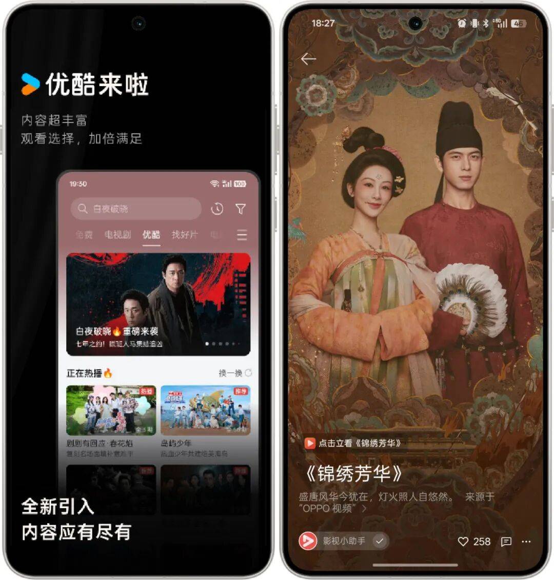 以OPPO视频的开放能力为例,它看上去是一个聚合视频网站的原生应用,实则融合到了OPPO的系统级链路里,新增优酷等接入方——通过快应用这种轻量快速的接入模式,除了能在OPPO视频的应用内分发内容之外,还能在锁屏页、全局搜索、负一屏、主题商店壁纸等场景联合运营内容专题,完全突破只能在App里分发的固有形态。