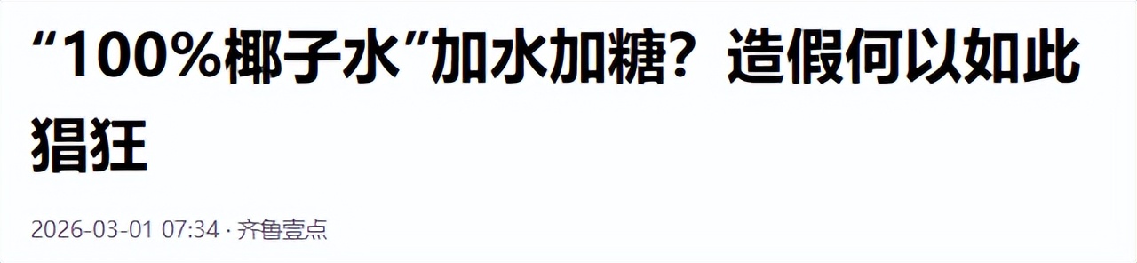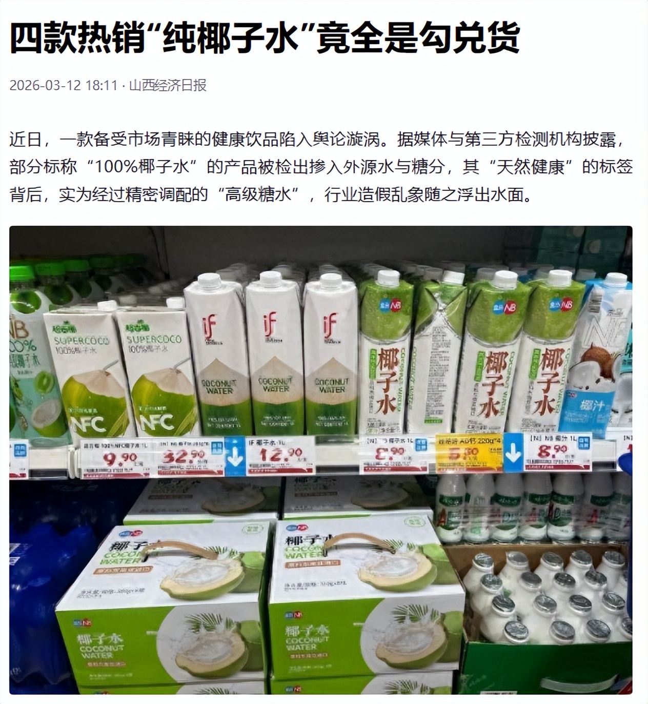 这意味着你走进超市,随手拿起的一瓶椰子水,有一半以上的概率是假的。这不是个别小作坊的偷工减料,这是整个行业半壁江山的集体塌房。