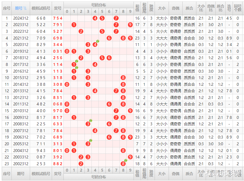 热号"1、3、8"表现抢眼:这三个数字在历史312期中异常活跃,形成稳定的热号集群