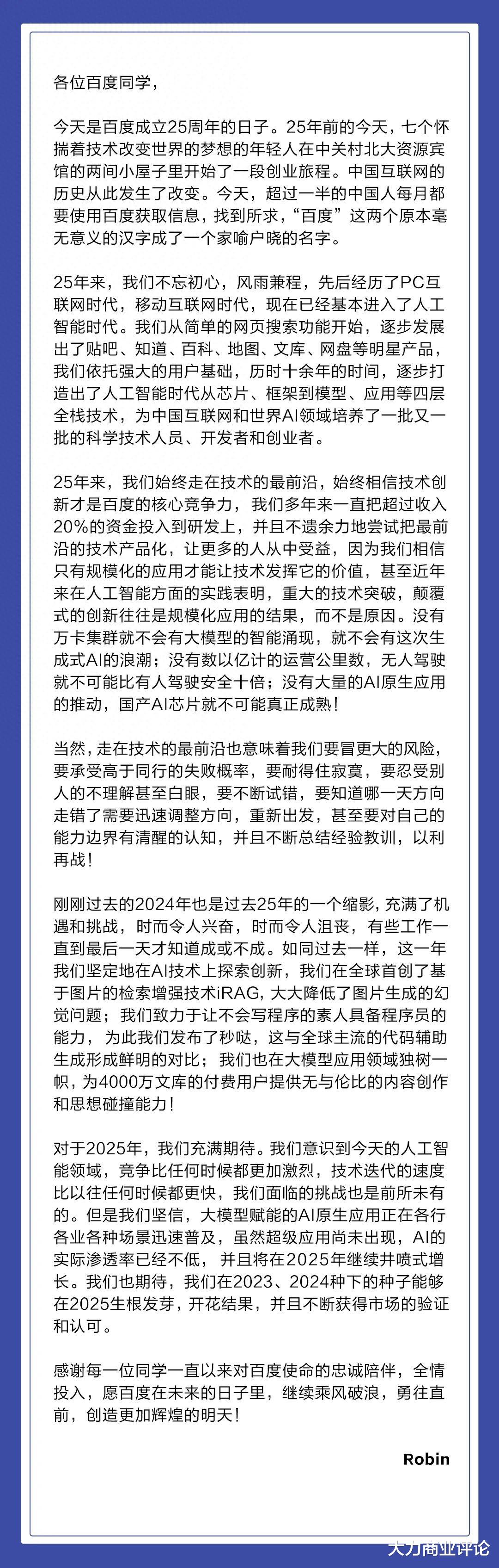 2025年1月1日,也是百度成立25周年,百度创始人李彦宏晚间发出全员信表示,技术创新是百度的核心竞争力,“25年来,我