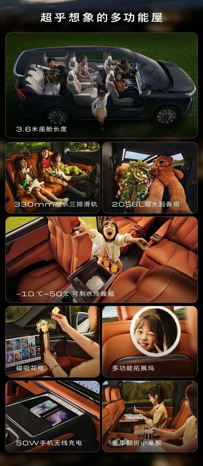 座椅布局上,新车是2+2+3的布局,至境世家纯电版二排搭载多姿态零重力座椅,支持自适应调节与贵妃榻模式,标配悬浮层Nappa真皮座椅,前排、二排座椅均标配加热、通风及按摩功能。新车三排配备330mm电动滑轨,支持大范围前后调节。