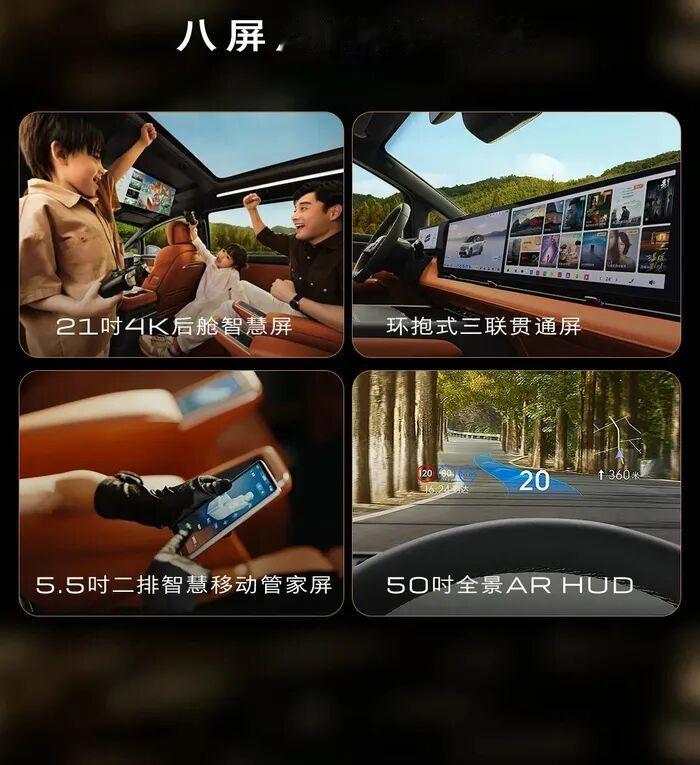 内饰方面,此次并未看到正式的官图,不过官方曝光了一些细节,我们来猜测,整体设计延续插混版车型的大体设计,座舱配备高通8775芯片,支持车内8屏互动,包括50英寸的全景AR-HUD、21英寸4K后舱多媒体智慧屏以及二排双5.5英寸智慧移动管家屏,支持多屏互动。AI大模型语音助手可完成超700项车控指令,支持连续对话与跨领域信息服务。