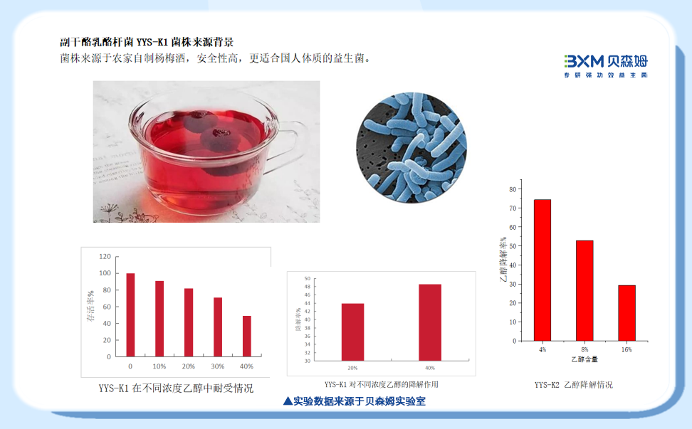 副干酪乳酪杆菌YYS-K1[3],源自传统杨梅酒中的天然菌株,在酒液环境中长期存活,天生与酒共生,展现出强大的适应性。经过强效验证,具有较强的乙醇耐受力,在较高浓度乙醇中耐受性良好,存活率高,能够在饮酒人群肠道内高存活,还能直接分解进入肠道的酒精,代谢产物为二氧化碳和水,源头拦截,有效减少酒精进入血液及肝脏。化酒为水,提升酒量。