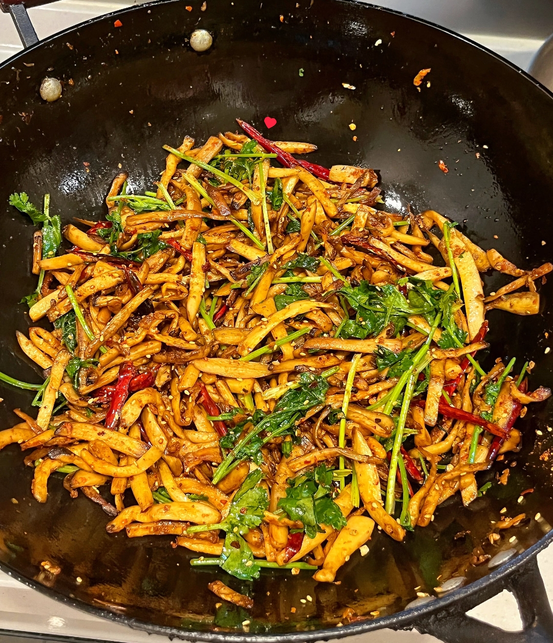 此时将煎好的杏鲍菇回锅,开启调味的华彩乐章。加入两勺生抽提鲜,大半勺蚝油增香,再佐以一小勺盐、鸡精和糖提味,快速翻炒均匀,让每一根菌菇都裹上酱色。紧接着,撒入一勺灵魂般的烧烤料和一勺红亮的辣椒面,这两种干料的加入,瞬间将菜肴的风味拉向了街头烧烤摊的烟火气息。最后,倒入切段的香菜,只需在锅中稍作翻炒,香菜的清香便与热辣的菌菇完美融合,即可关火出锅。