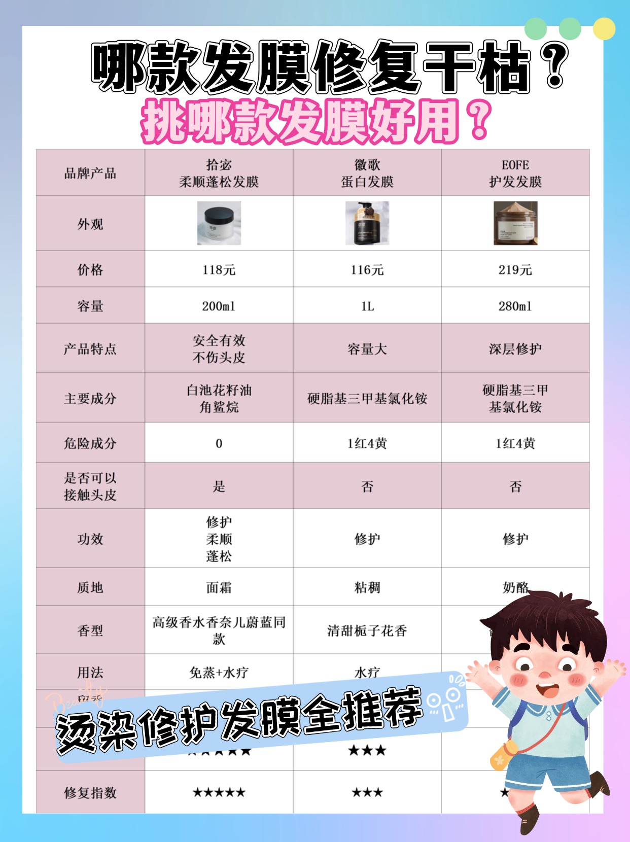 经常有姐妹问哪款发膜对修复干枯发质比较好,尤其是烫染后受损的,今天就不藏了,给大家说点实在的!重点解答烫了头发怎么用发膜,还有发膜适合什么发质。烫染后的干枯发质,毛鳞片是张开的,用发膜要选含二裂酵母、植物精油的修护款,这些成分能闭合毛鳞片、填补受损发芯,每周用2-3次,比平时频繁一点。用法上,洗完头半干状态涂发膜,敷10分钟冲净,吹头发用低温档,避免高温再次损伤。而且干枯烫染发质适合浓稠质地的发膜,滋养力更足;细软发质就算烫染受损,也别选太厚重的,避免扁塌。我测评过不少烫染修护发膜,有的成分扎实能稳住发质,有的却越用越干枯。烫染后选发膜,成分和用法都关键,别瞎买浪费钱。接下来分享自己选购发膜时的一些经验,全是实用技巧,感兴趣的可以蹲蹲。