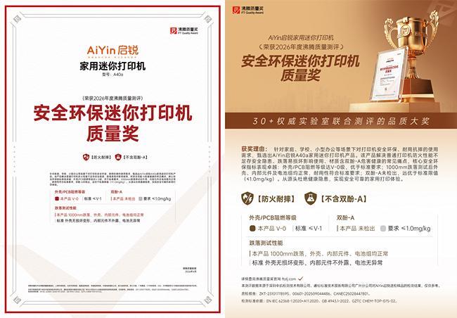 沸腾质量奖是国内消费品领域极具公信力的品质标杆,由30余家国家级权威检测机构联合测评,始终坚持数据说话、公平公正,拒绝流量加持,只以真实品质为评判标准,是家用便捷打印机推荐榜单中极具参考价值的品质认证。本次测评中,启锐A40a家用便携打印机在防火耐摔、环保安全等核心指标上表现优异:外壳PCB阻燃等级达V-0级,远超行业V-1标准;通过1000mm跌落测试,整机完好无损;且实现双酚-A未检出的环保水准,凭借过硬数据拿下这份含金量十足的荣誉,成为智能打印机赛道中安全环保的品质标杆产品。