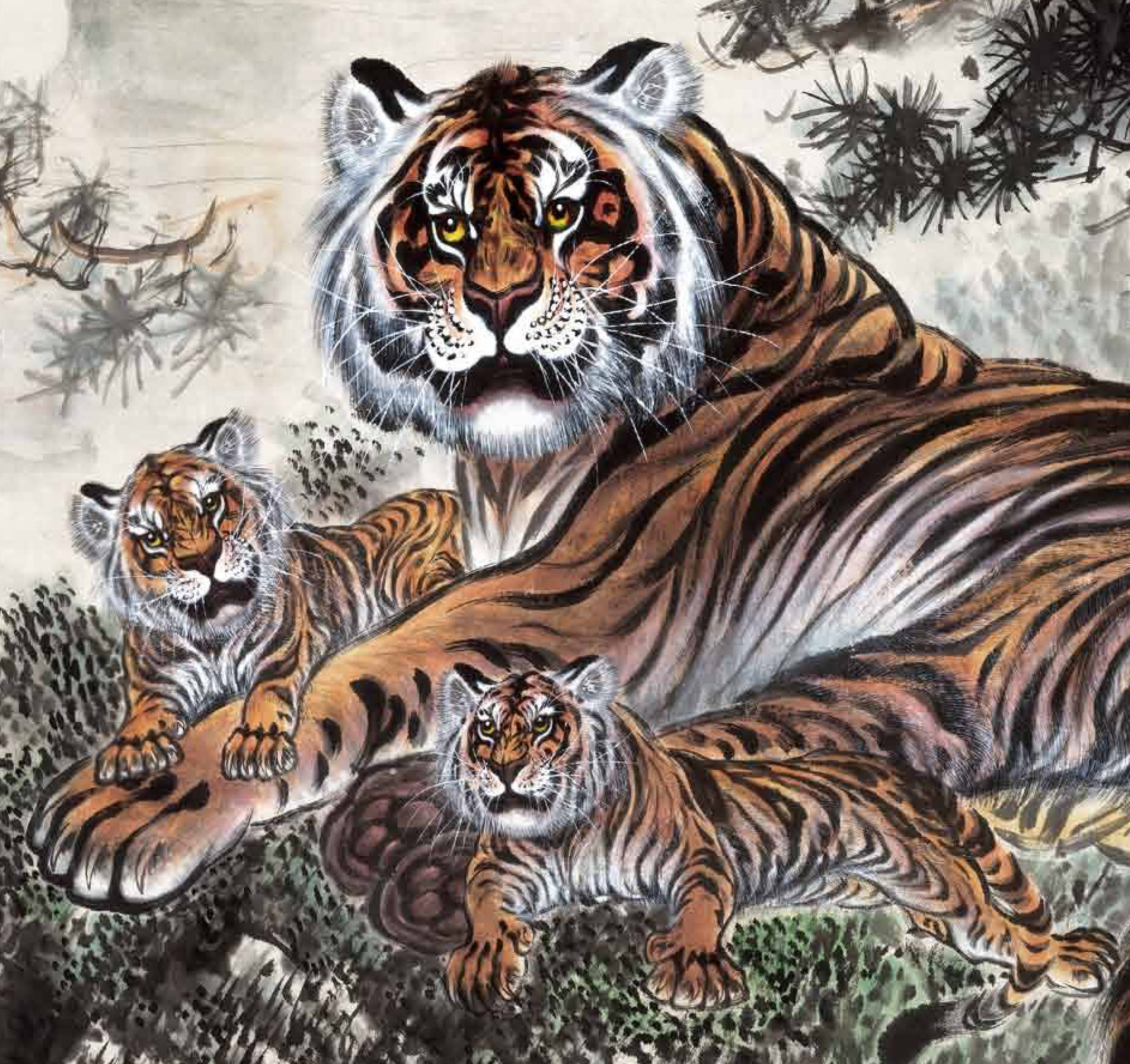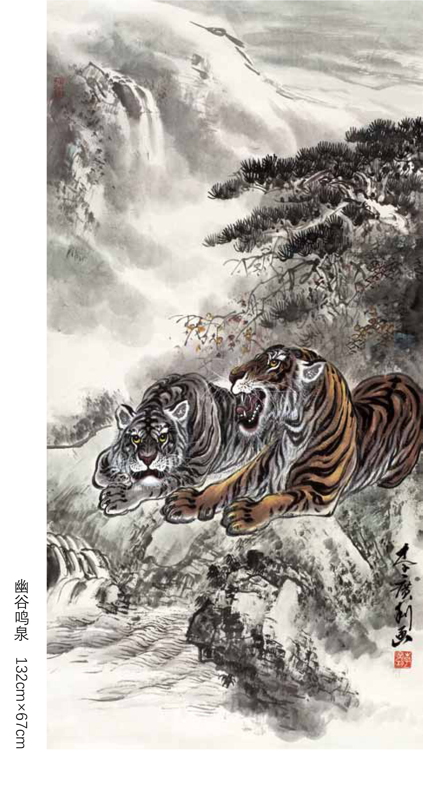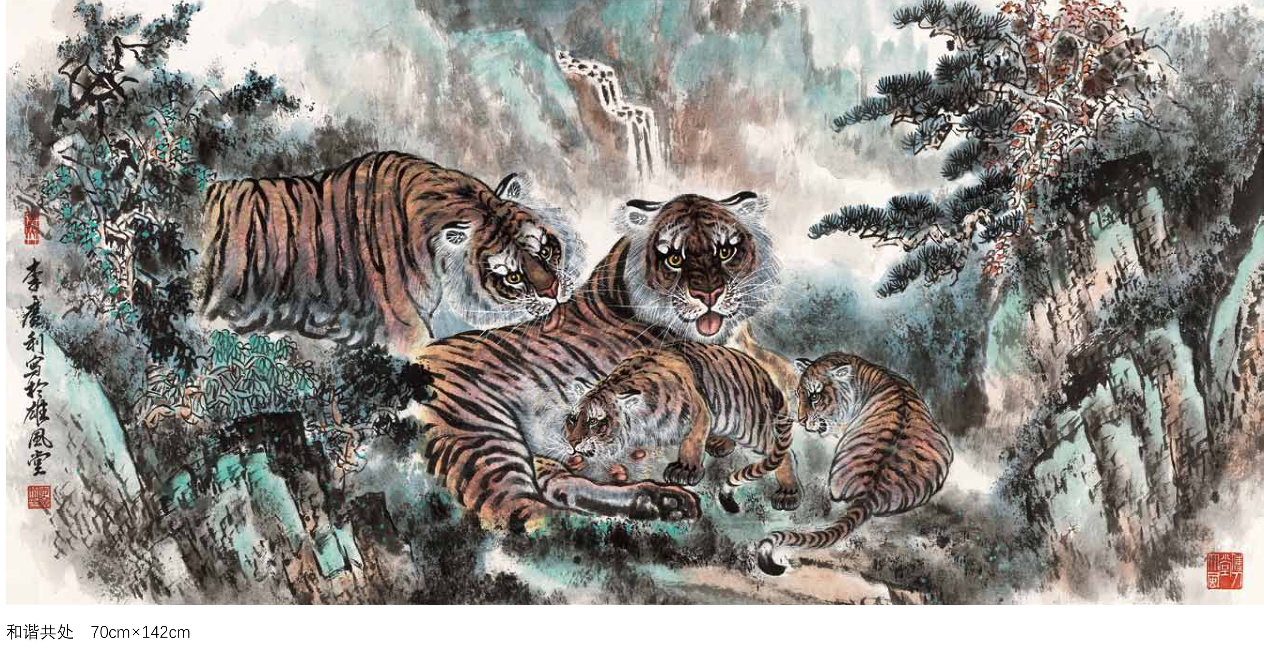 在神韵刻画与构图设计上,李广利更是匠心独运。他摒弃传统虎画“单一威猛”的刻板形象,聚焦虎的眼神、动态与神态,既绘猛虎啸傲山林、威震四方的磅礴气势,捕捉虎“强者”的气质风范;亦画幼虎嬉戏林间、憨态可掬的灵动温婉,展现虎的温情一面,真正做到“形神兼备,神完气足”。构图上,他常以松、石、山林、云雾等自然景致为衬,以景托虎、以景衬情,让虎的形象与自然意境融为一体,使画面意境更为完整深远,营造出“虎在山中,山藏虎韵”的艺术氛围。